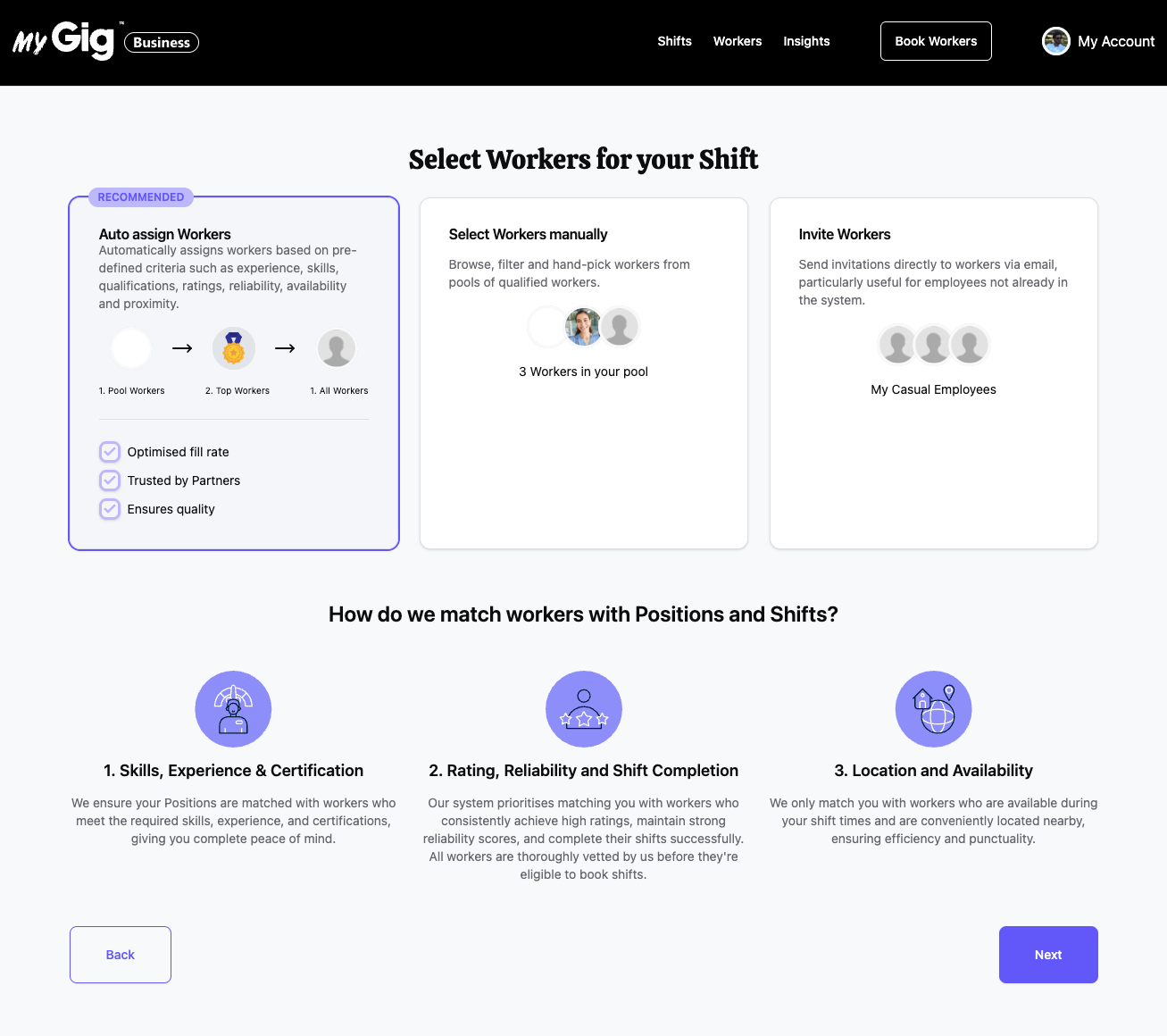 - Option 1: Auto-Select = You trust our AI and Algorithm to pick the right workers. We will pick workers from your pools first.