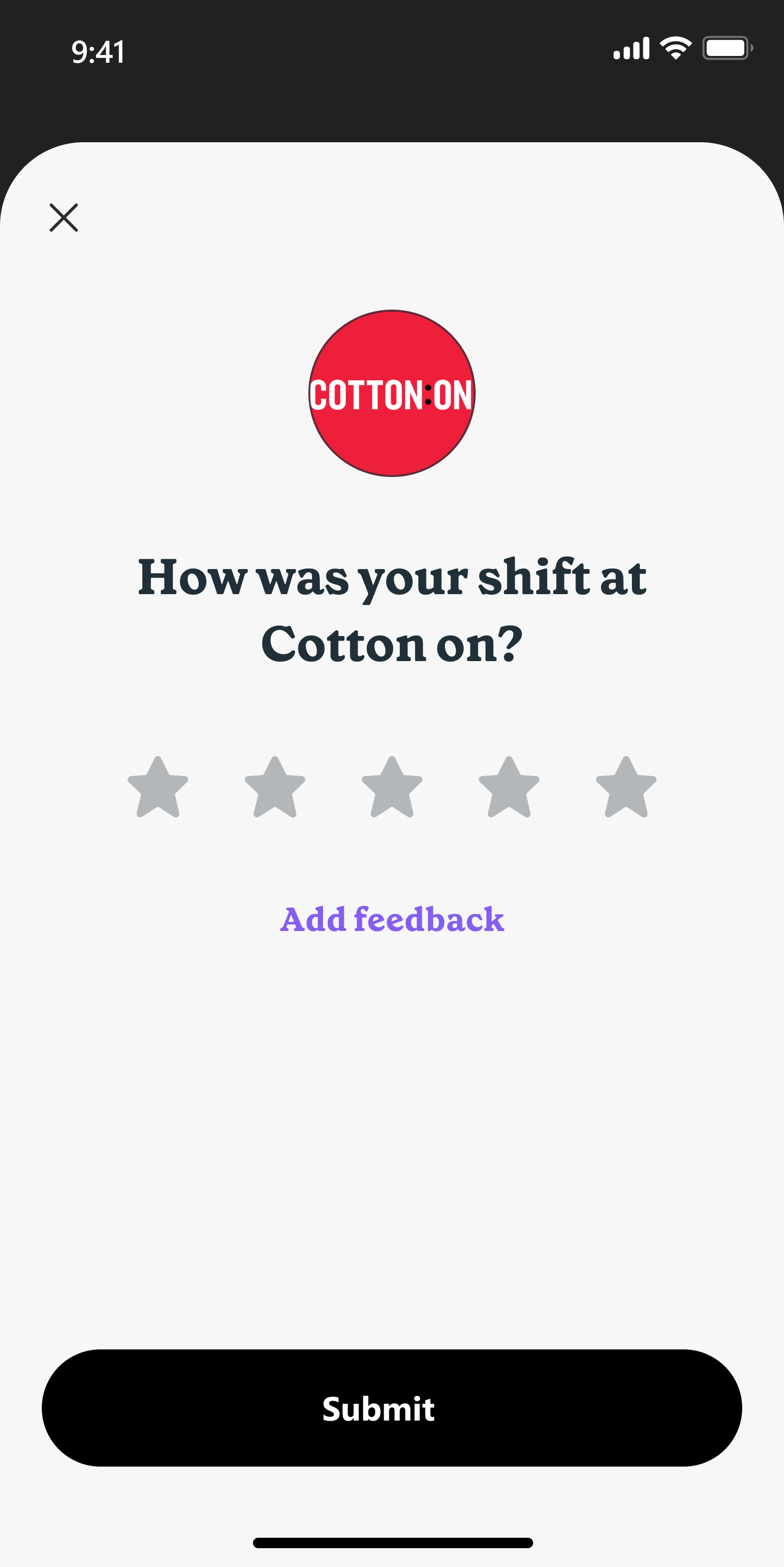 After every shift, you’ll be asked to rate your experience from 1 to 5 stars. This quick step helps MyGig improve the platform and make future shifts better for everyone.